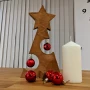 This Christmas tree is made of plywood and is decorated with two Christmas baubles. The tip of the tree is star-shaped. This product is entirely handmade in UK, using quality materials. It is a great idea for Christmas, as a Christmas decoration or as a gift.